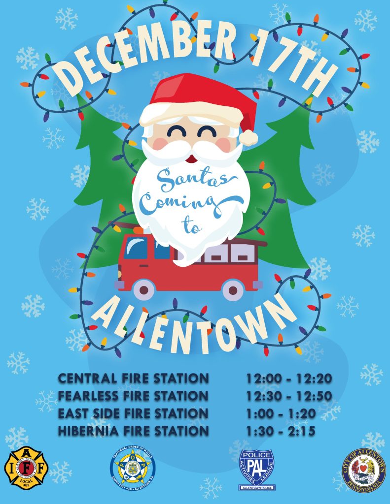 Allentown, PA – The City of Allentown will host “Santa on a Truck” on Saturday, December 17 from 12 to 2 p.m. Santa Claus will travel escorted by firefighters and police officers on a fire truck to four fire stations across the City. The fire truck will stop and give candy canes to any children they see along the way.