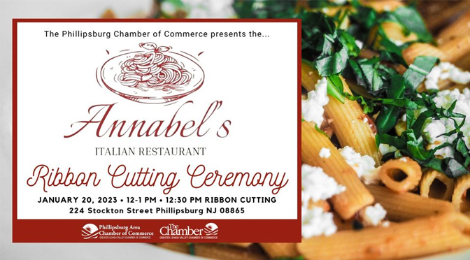 Join the Phillipsburg Area Chamber of Commerce on Friday, January 20th from 12-1pm to celebrate the grand opening and ribbon cutting of Annabel’s Italian Restaurant (located at 224 Stockton Street Phillipsburg NJ 08865) This new business has opened in the former Marianna’s Restaurant space.