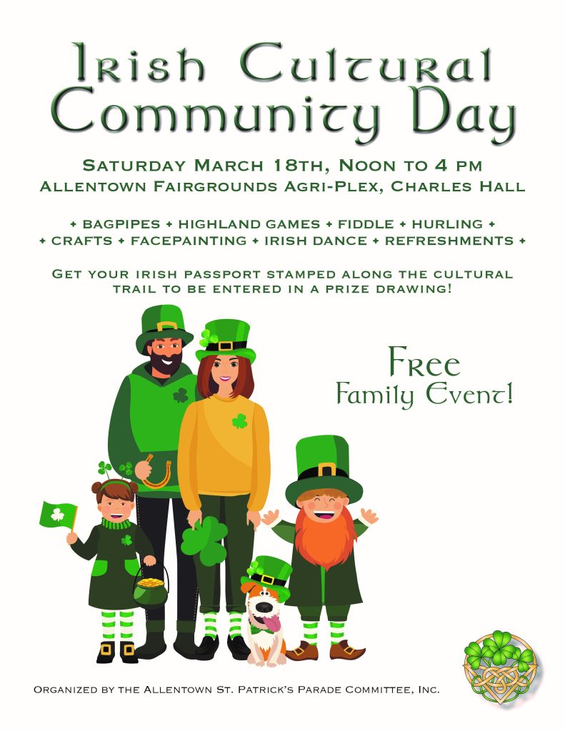 The Annual Irish Cultural Community Day will be held at the Agricultural Hall Annex at the Allentown Fairgrounds and is presented by the Allentown St. Patrick’s Parade Committee. Irish Cultural Community Day is a family friendly FREE event and features Irish dancers, hurling demonstrations, Celtic games, face painting, music and an Irish passport to get stamped. See the presentation of awards to the local schools Poster Contest winners. Snacks and soft drinks are included. This is a day full of fun activities for kids of all ages! For more information go www.allentownstpatricksparade.com