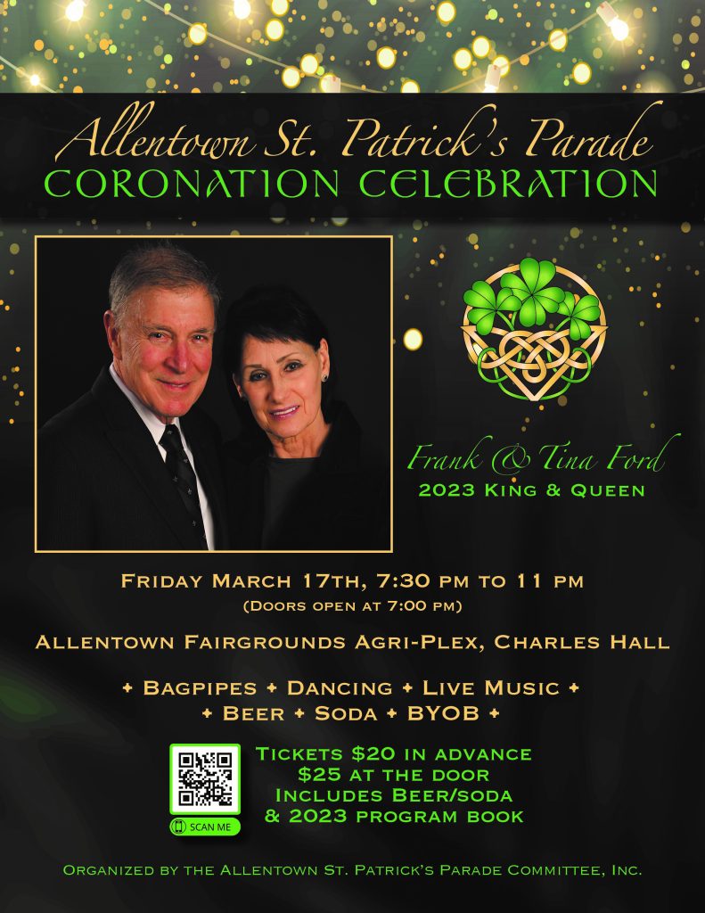 The 2023 King and Queen of the Allentown St. Patrick’s Parade will be crowned at the annual Coronation Celebration in the Agricultural Hall Annex, (Charles Hall),at the Allentown Fairgrounds. Purchase discounted advance tickets on the website or regular price at the door.