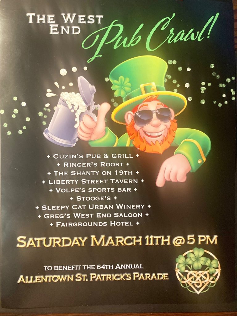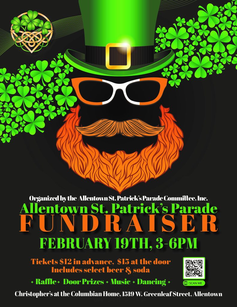 Join us for the annual Allentown St. Patrick’s Parade Fundraiser on February 19th, Sunday, 3pm to 6pm. Location is 1519 W. Greenleaf St Allentown PA 18102. Tickets are $12 in advance on website https://allentownstpatricksparade.com/tickets/ or $15 at door. Tickets include select beer and soda with our amazing Basket Raffle and Door Prizes. A DJ for music and dancing, also, Irish fare food is available for purchase. Proceeds benefit Allentown St. Patrick’s Parade. Bring a non-perishable food item to benefit local food pantries right here in Allentown!