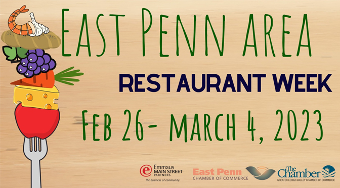 The Emmaus Main Street Partners East Penn Area Chamber of Commerce, a proud partner of the Greater Lehigh Valley Chamber of Commerce and New Tripoli Bank present East Penn Area Restaurant Week!