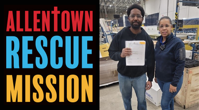 (ALLENTOWN, PA) – The Allentown Rescue Mission’s Clean Team Workforce would like to congratulate Chris W. for not only being selected Employee of the Month for January but also for being hired full-time by Trinity Glass International, Inc., a local manufacturer of exterior and patio doors.