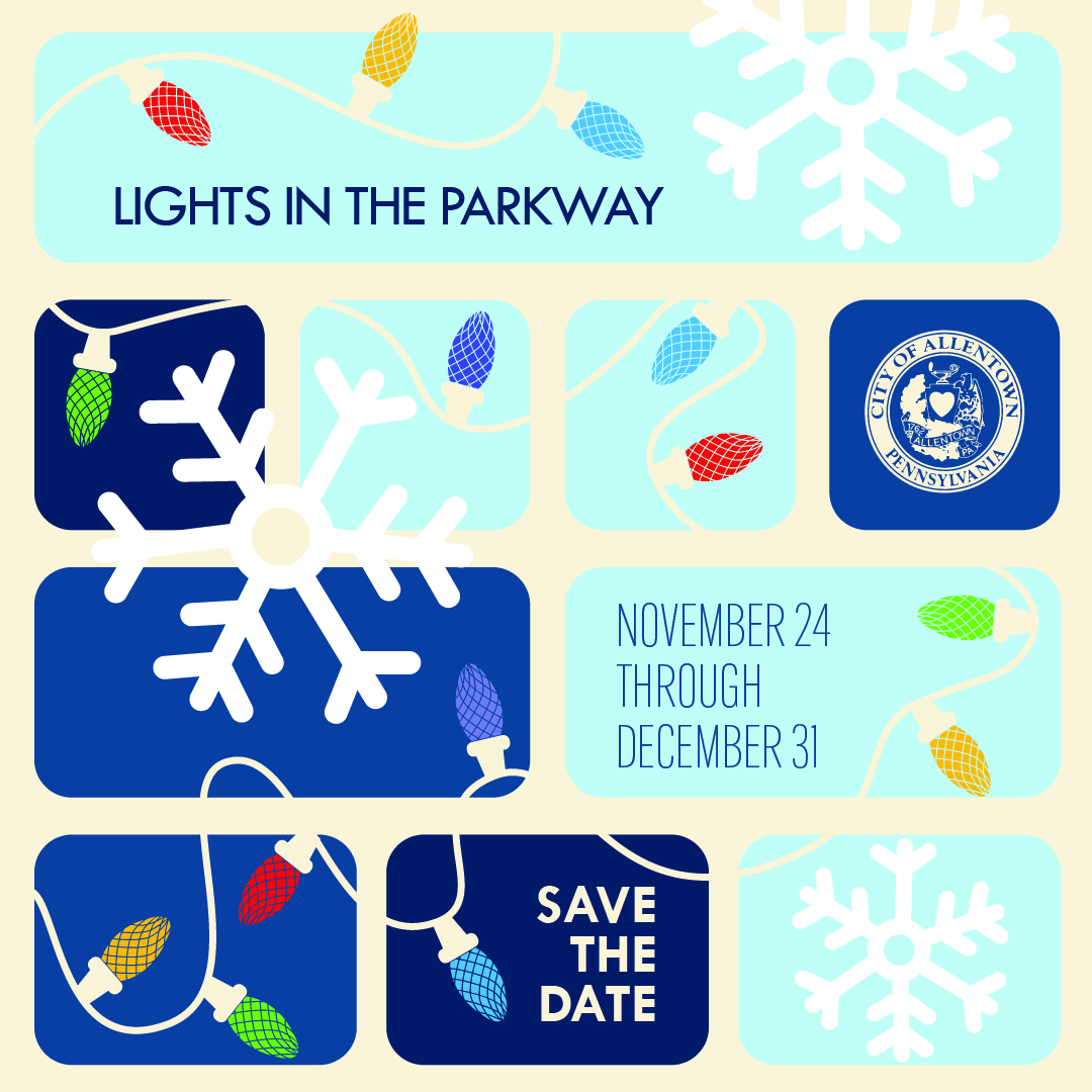 The 27th annual Lights in the Parkway drive through display transforms over a mile of Lehigh Parkway into a winter wonderland with thousands of dazzling lights. Sponsorship opportunities, ticket information, and updates can be found at www.allentownpa.gov/lightsintheparkway.