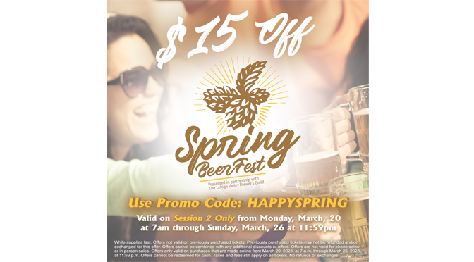 As a kickoff to the first day of spring and hopefully warmer weather, ArtsQuest is offering a $15.00 discount toward the second session admission price. (Session one runs from 2-4 p.m. / Session two runs from 5-7 p.m.). The offer is only valid on new purchases made online for the 2nd using promocode HAPPYSPRING from Monday, March 20 thru Sunday, March 26 at 11:59pm. Purchase tickets on SteelStacks.org.