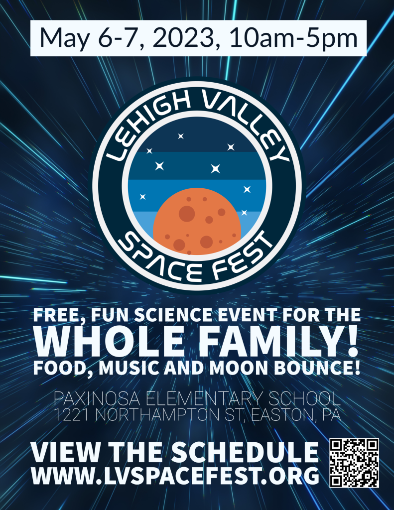 This ticketed event supports the inaugural Lehigh Valley Space Fest, an event focused on Space & Astronomy with educational and fun activities for the whole family. Space related presentations, kids games & activities, vendors and more will be throughout the day on Saturday May 6th and Sunday May 7th at Paxinosa Elementary in Easton, PA. See the Lehigh Valley Space Fest website for a detailed schedule https://www.lvspacefest.org/. The Lehigh Valley Space Fest is a free, family oriented event that is open to all age levels.