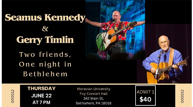 Bethlehem, PA – April 10, 2023 – The Celtic Cultural Alliance (CCA) is pleased to announce SEAMUS KENNEDY & GERRY TIMLIN, in concert together on June 22nd. Two of the most recognized names in Irish entertainment.