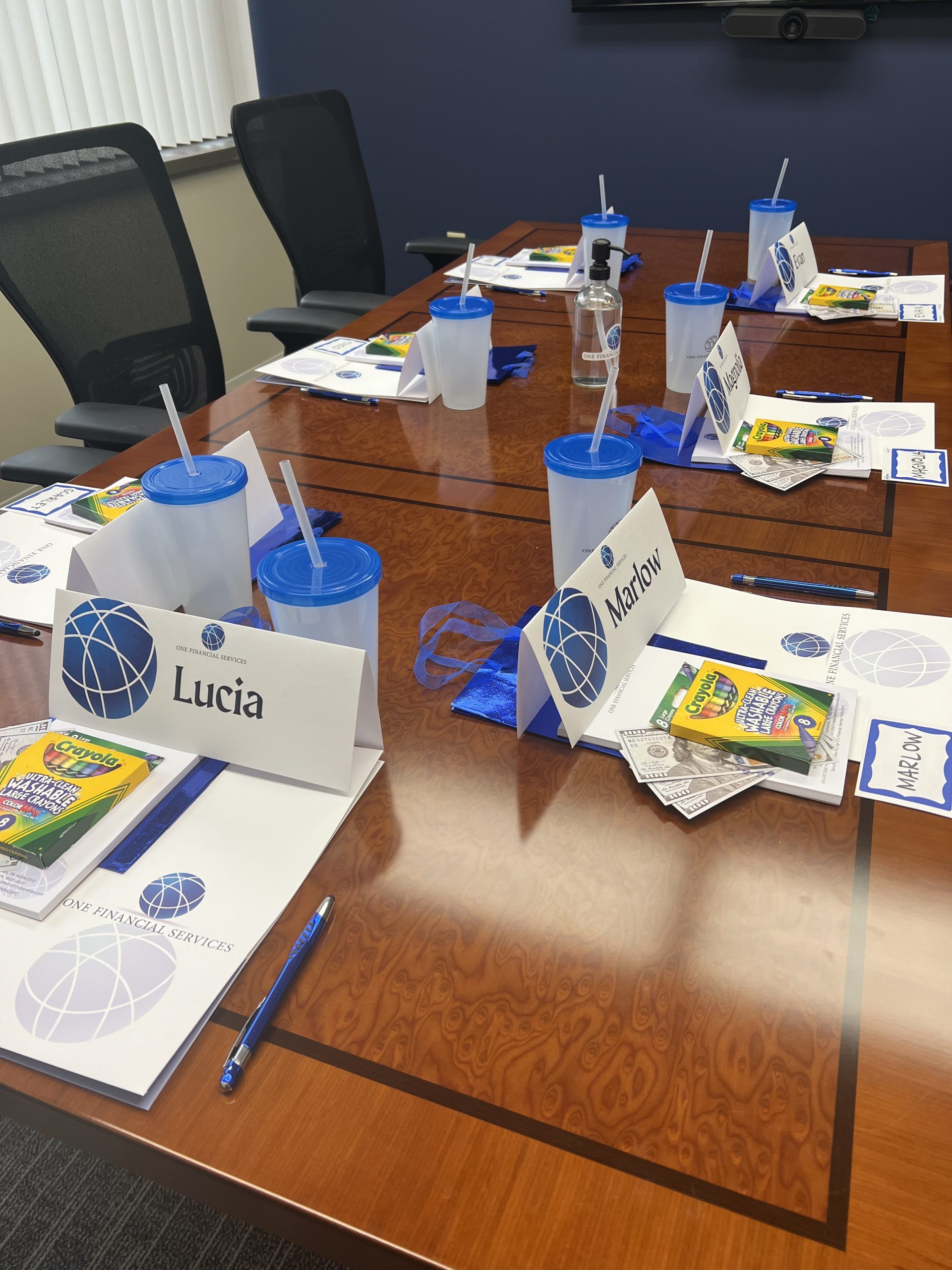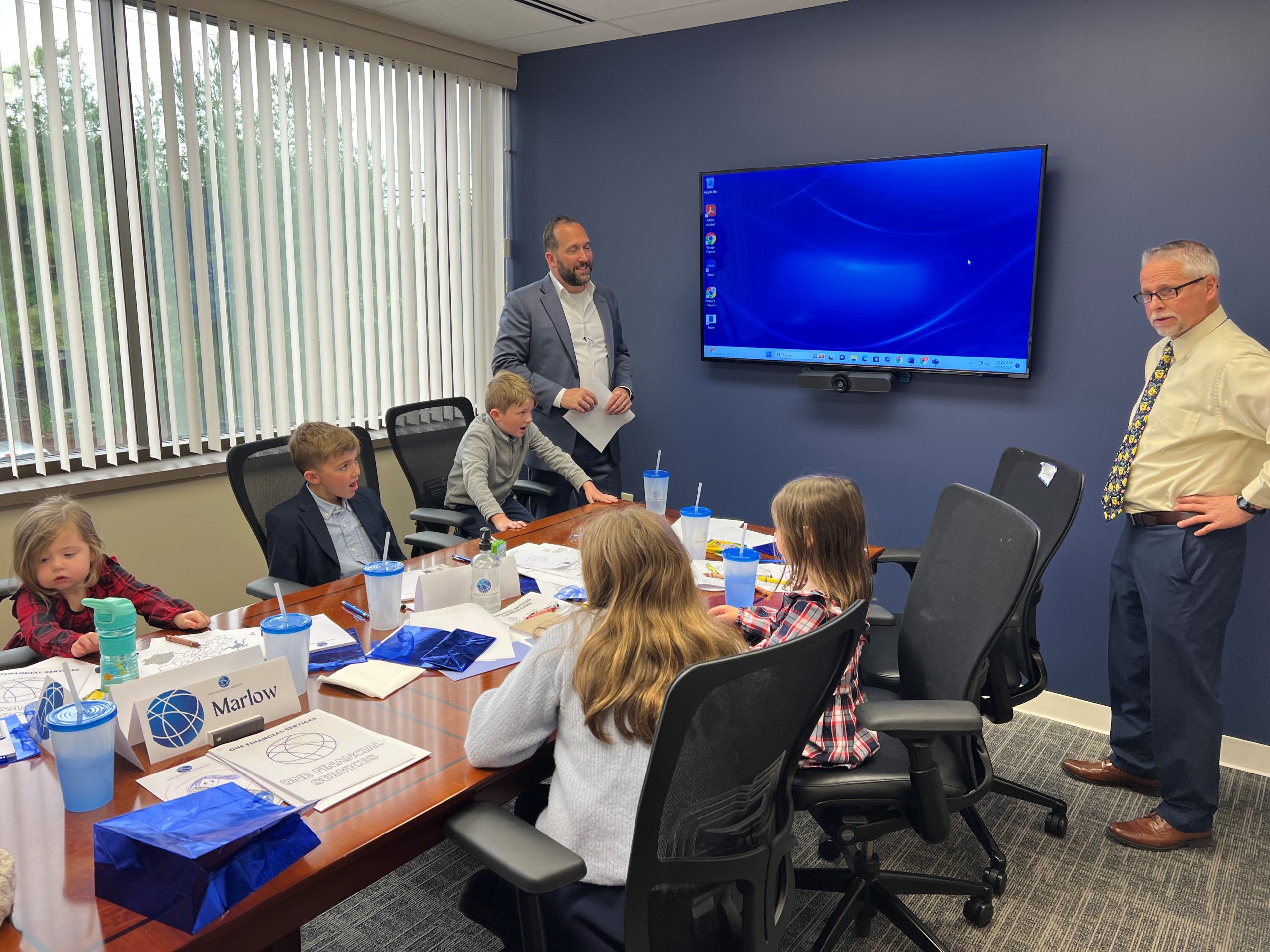 The day culminated in a pseudo client meeting led by Partner and Wealth Advisor Rob Pretopapa, CFP ® and father of four attendees, Lucia, Marlow, Theo, and Nico. The pretend client was One Financial Services Client Relationship Coordinator Support Dan Patton who recently retired as a school administrator with over 27 years of experience in education. With the parental and professional experience between Rob and Dan, the kids were able to better understand why people buy stocks, what it means to buy them, and how the stock market can fluctuate over time. They learned about how advisors work with their clients to understand their short- and long-term goals and how things may need to change depending on those goals.