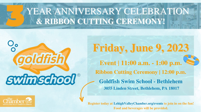 BETHLEHEM, PA – Goldfish Swim School will host a 3-Year Anniversary Celebration & Ribbon Cutting event at the school’s Bethlehem location on Friday, June 9, 2023, from 11 a.m. – 1 p.m. Ribbon cutting will take place at 12 p.m. Members of the media are invited to attend.
