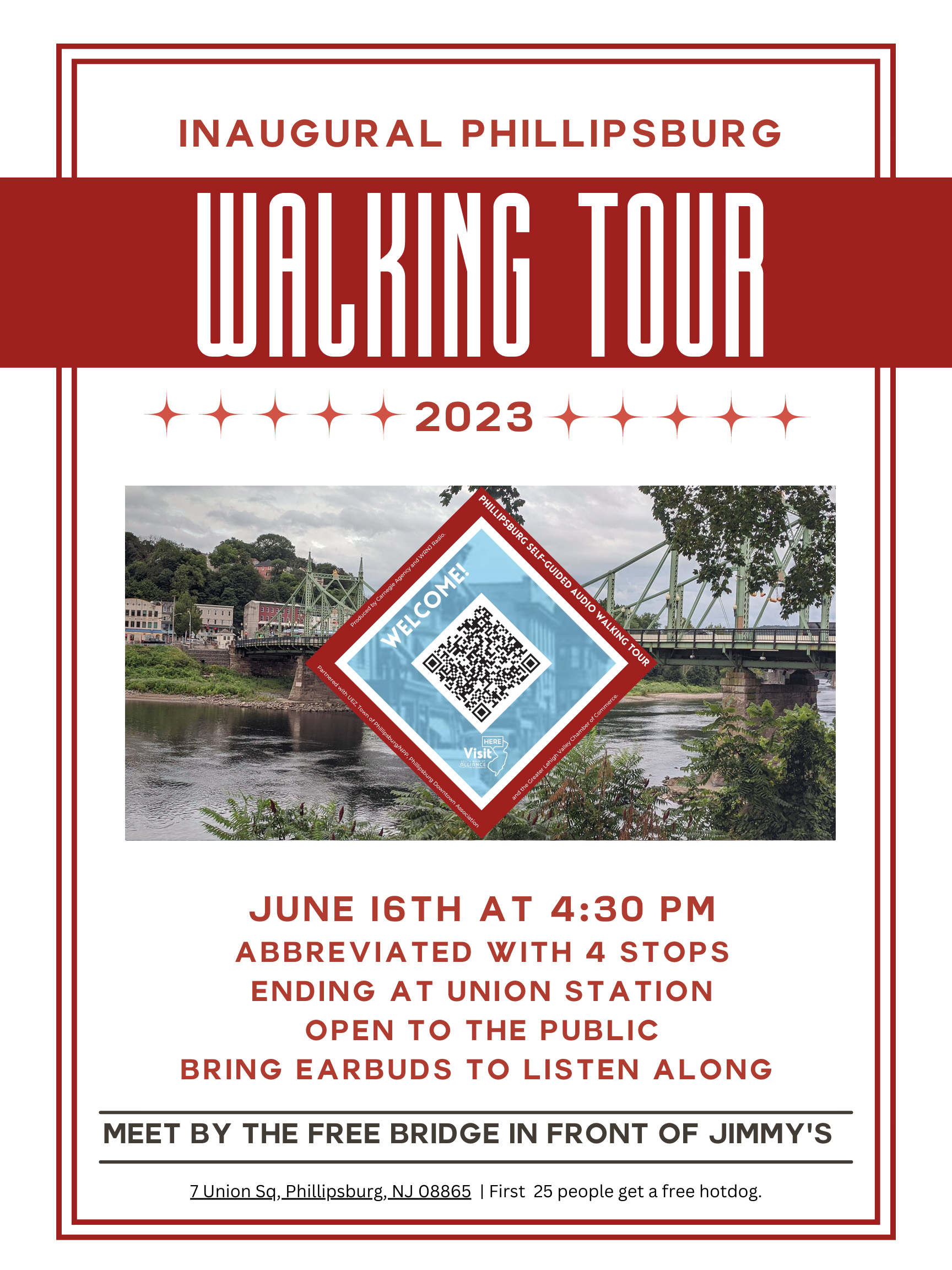 - First Guided Audio Walking Tour: 4:30-5:30 PM FREE starts at Riverside Way Phillipsburg, NJ