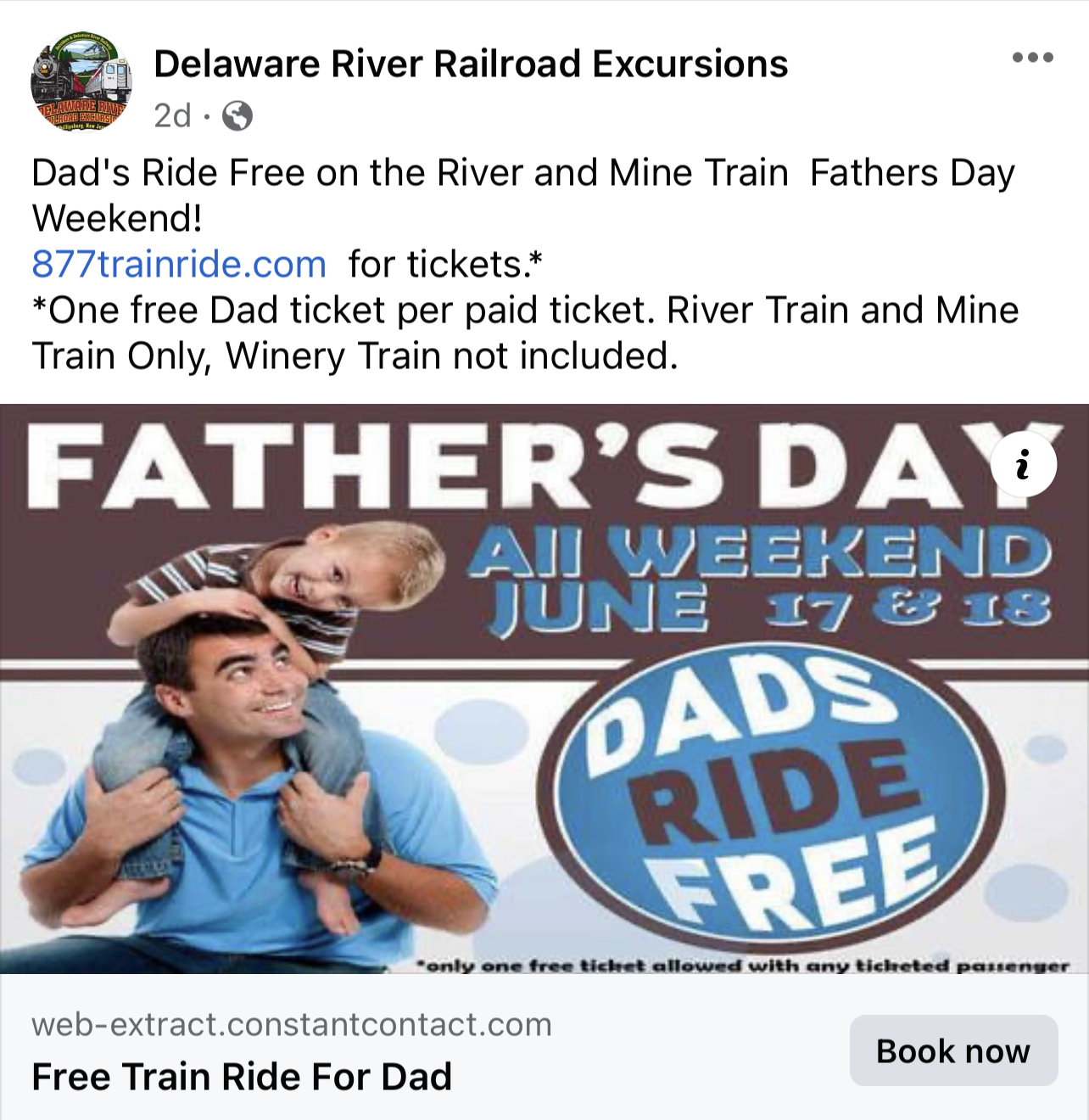 DAD’S RIDE FREE- Dad’s Ride Free on the River and Mine Train Fathers Day Weekend! *One free Dad ticket per paid ticket. River Train and Mine Train Only, Winery Train not included. Train ride excursions are a great way to explore the area and take in the scenery.