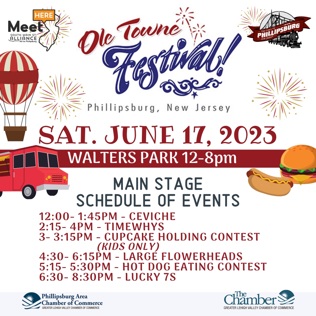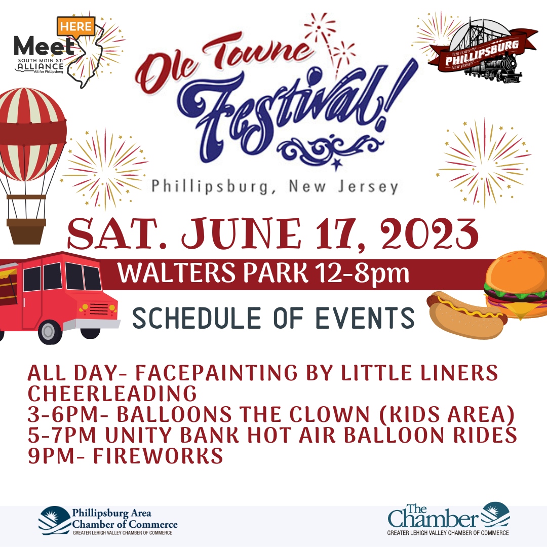 The Phillipsburg Chamber of Commerce is celebrating 35 years of the annual Phillipsburg Ole Towne Festival in Phillipsburg, New Jersey! This year’s festival takes place Saturday, June 17th. The day will be jam-packed with festival favorites and fresh entertainment for attendees of all ages. Live Music, Food & Craft vendors & Fireworks