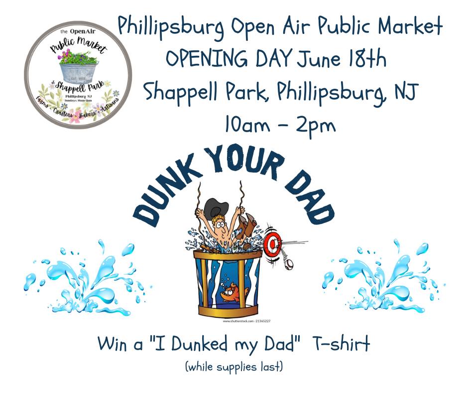An open-air market is a great way to support local businesses and artisans Every Sunday June 18 through October 29. Opening Day “DUNK YOUR DAD” in our dunk tank $1 per ball, and you could win an “I Dunked My Dad” t-shirt!!! While supplies last. The first 50 Dads will receive a FREE hot dog! Stop by the information booth for your ticket. Plus, we will have FREE popcorn at the information booth as well as kids’ activities. Music will be provided by Rob Viola.