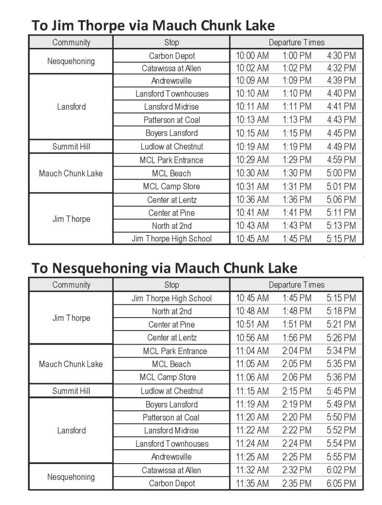 Carbon Transit will run three trips per day serving Nesquehoning, Lansford, Summit Hill, Mauch Chunk Lake, and Jim Thorpe. Using CT vans the service is designated as Route 741. Bus stops at the Lake will be at the beach as well as the Camp Store.