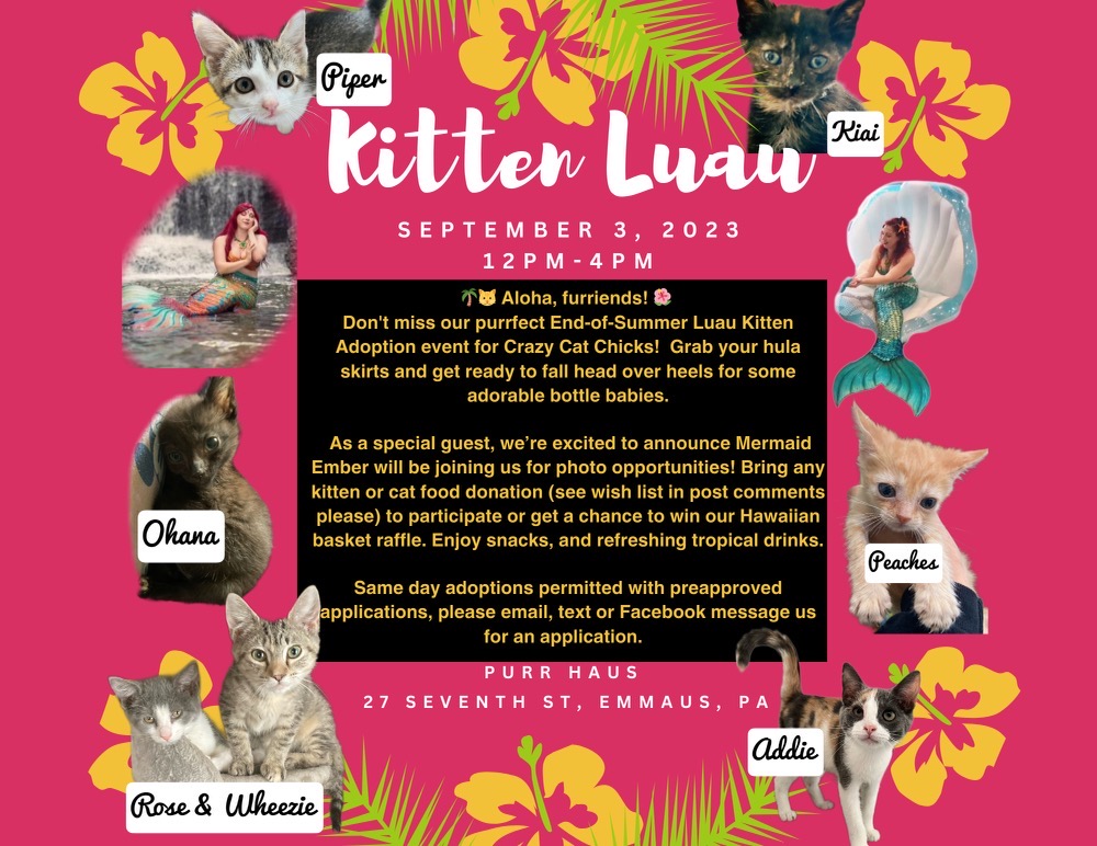 Emmaus, Pa.- Purr Haus, an Emmaus boutique that hosts weekend adoption events for 13 Lehigh Valley cat rescue groups, will celebrate the milestone of reaching 100 adoptions with a “Kitten Luau” featuring live mermaids on September 3.