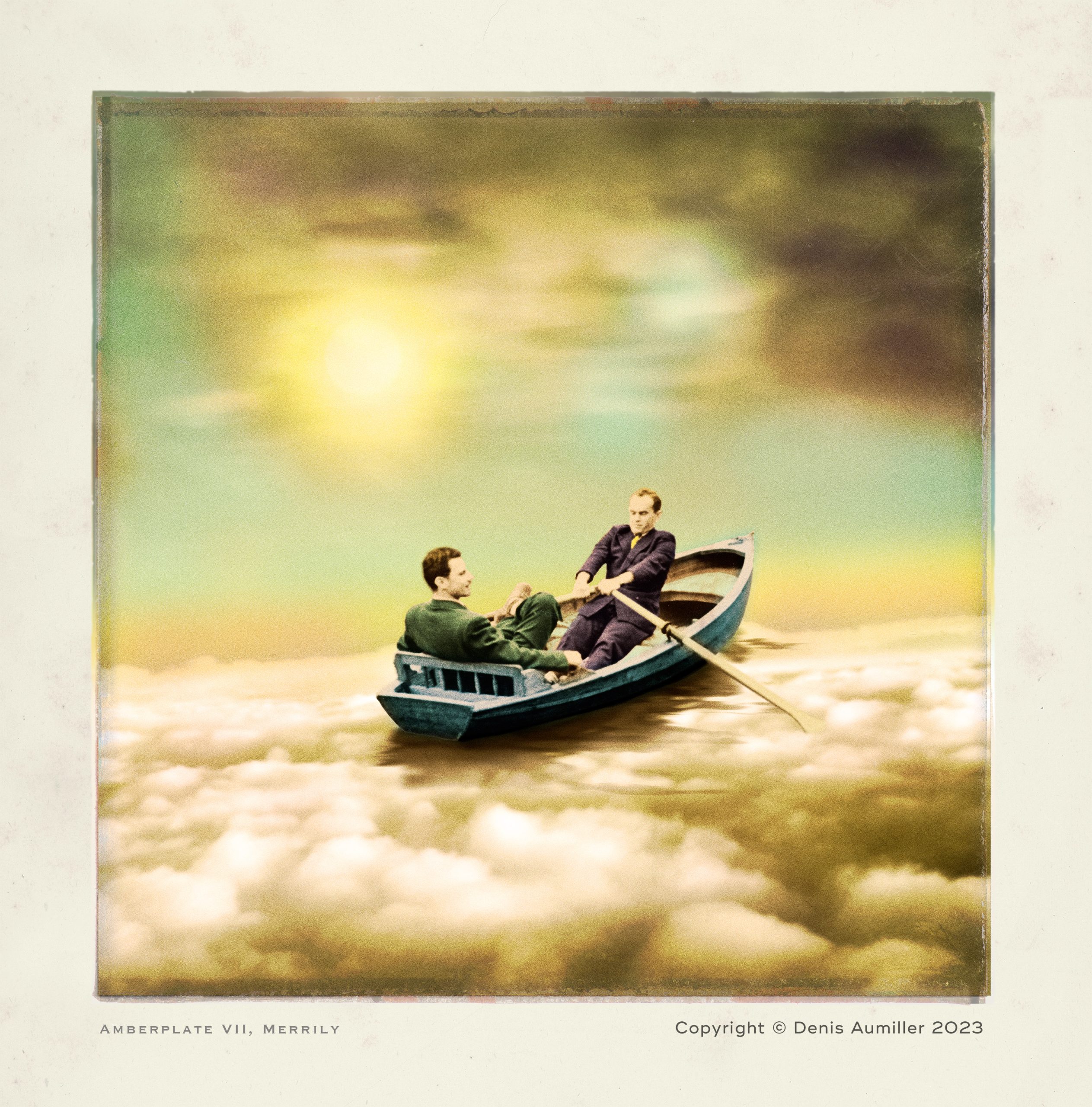 In “Merrily,” two men, oddly dressed in suits, row confidently into the unknown in a sea of clouds.