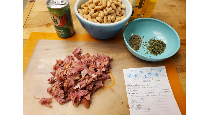 I got to work shopping for the ingredients and the goal was to have it ready for dinner that night. My dad always tried to save money where he could, and he taught me ways to do the same. He was a bargain shopper at the grocery stores, haha. I’m sure he was watching over me for the deal I found, because I wasn’t really looking for them at the time. I needed great northern, or cannellini beans and I found small white beans on the discount rack (dented cans). Grabbed 3 cans at $.64 each, plus the ham bone for $1.00. The other ingredients I always have on hand. This dish came together quickly and cost roughly $5 to make 3 servings.