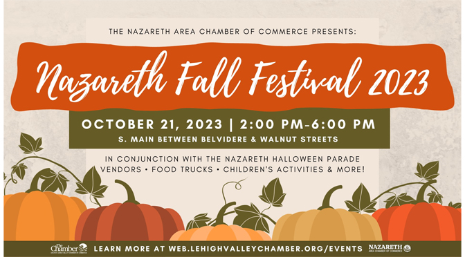 The Nazareth Area Chamber, a proud partner of the Greater Lehigh Valley Chamber is thrilled to be hosting the annual Nazareth Fall Festival, in partnership with Vigilance Hose Co. #1, on Saturday, October 21th, 2023 from 2 PM – 6 PM (Rain or Shine). Get ready for a day filled with fall-themed fun for everyone!