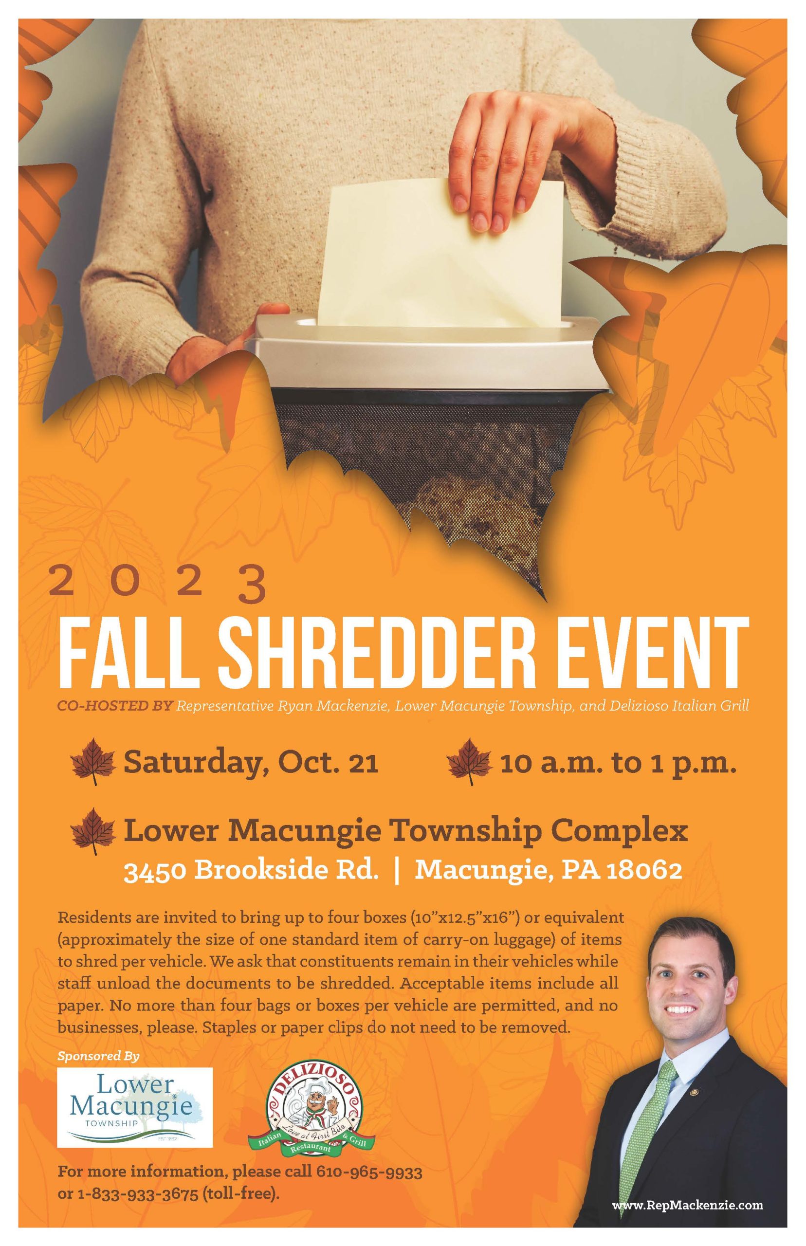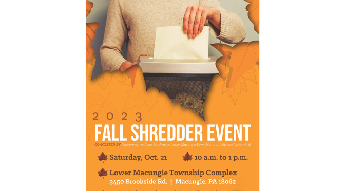 There may be rain in the forecast for Saturday, but that’s not going to stop us from holding our annual Fall Shredder Event from 10 a.m. to 1 p.m. at the Lower Macungie Township Complex, 3450 Brookside Road in Macungie. The township and Delizioso Italian Grill have joined us in hosting the free event.