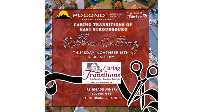 Join us in celebrating the grand opening of Caring Transitions of East Stroudsburg! On November 16th, 2023, from 5:30 pm to 6:30 pm, we will give a special Ribbon Cutting to commemorate the occasion. The Ribbon Cutting will begin promptly at 6:00 pm. These special festivities will continue until 7:00 pm! Don’t miss this special celebration! This is a free event to attend!