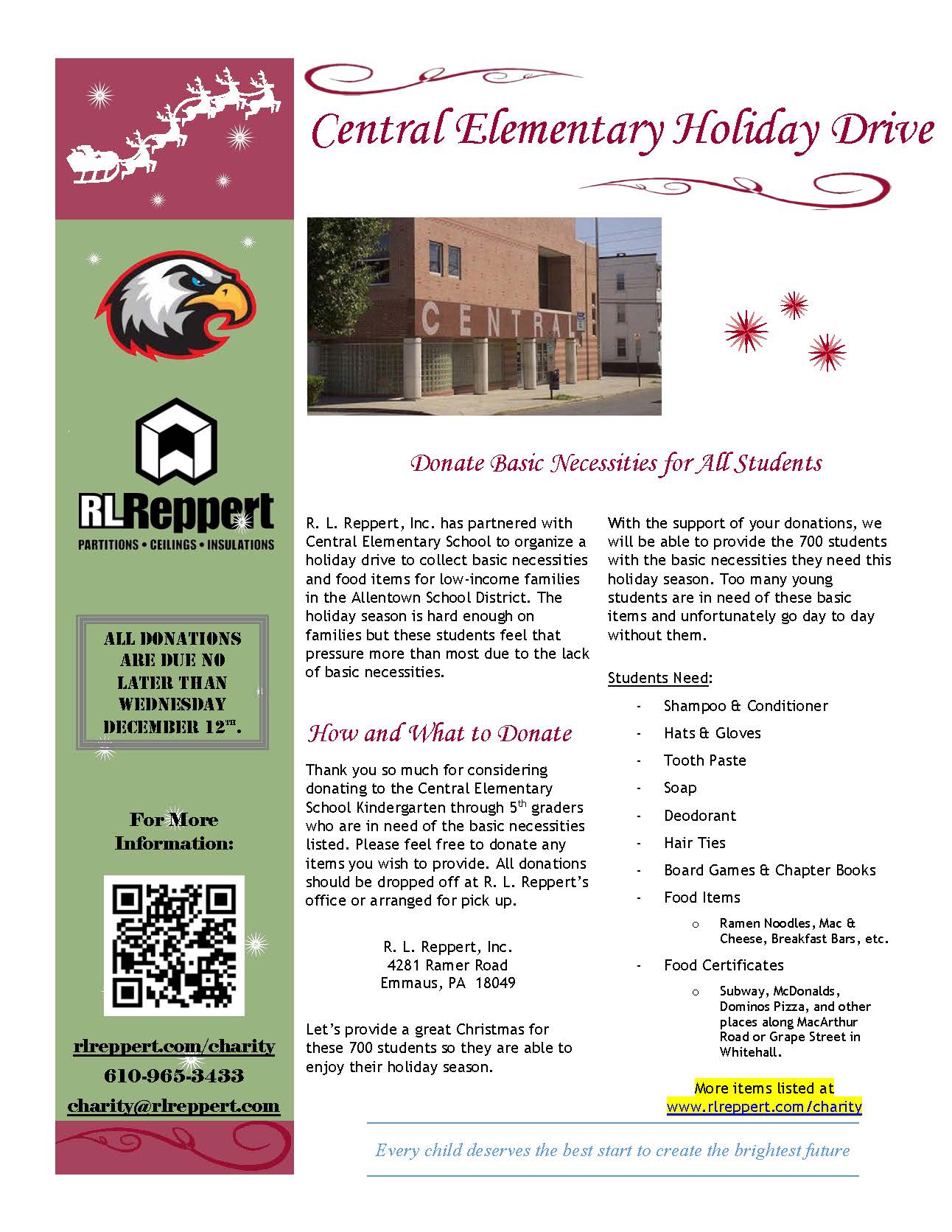 R. L. Reppert, Inc. has partnered with Central Elementary School to organize a holiday drive to collect basic necessities and food items for low-income families in the Allentown School District again this year. The holiday season is hard enough on families but these students feel that pressure more than most due to the lack of basic necessities. When the students were asked by their teachers what they wanted for Christmas, most of them said food or basic necessities. “I do not believe that any child should go without the basic necessities or food in this day and age. Every child deserves the best start to create the brightest future.”, stated Ric Reppert, President of R. L. Reppert. Some of these students rely on the school for breakfast and lunch during the school year because without it, they do not eat these meals. During the Christmas break, these students will struggle to get the food they need. We have all joined together to ensure these students do not go without food during the Christmas break and have the basic necessities they need. Every child deserves the best start to create the brightest future. With the tremendous support of everyone involved, R. L. Reppert will be donating over 17,500 items for the 700 students of Central Elementary School. Plus additional bags of food for all the homeless families at Central Elementary School. In the last 3 years, R. L. Reppert has donated over 51,000 items to over 1,830 students including 83 homeless families. More information can be found at www.rlreppert.com/charity.