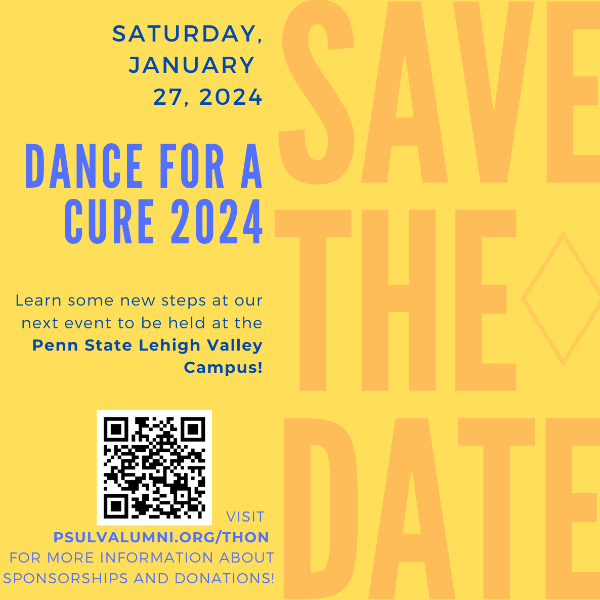 Penn State Lehigh Valley Alumni Society joins Penn State Lehigh Valley to host the 12th Annual Dance for a Cure fundraising event on January 27, 2024 from 5 PM to 10 PM to contribute to the THON 2024 total! The $60 admission ticket includes food, up to 3 drinks, dance lessons, feature entertainment, plus raffles and a silent auction.