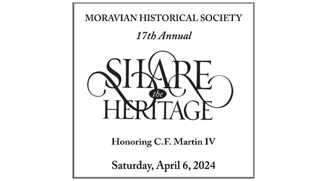Nazareth, PA—The Moravian Historical Society announces its 17th Annual Share the Heritage Gala will take place on Saturday, April 6, 2024 at the Northampton Country Club. The annual Gala is the Museum’s primary fundraiser, raising vital funds for all operations, including exhibitions, programs for children and adults, and the preservation of the historic site. The Gala will feature cocktails, dinner, live music throughout the evening, and both a silent and live auction.