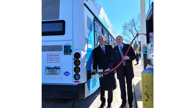 Featured Image: Shaun Hart, VP at UGIES and Owen O’Neil, Executive Director of LANTA at the ceremonial ‘first fill’ of a LANTA Bus using Renewable Natural Gas sourced from Pennsylvania landfill. LANTA is the first transit agency in Pennsylvania to utilize this renewable energy in its fleet.