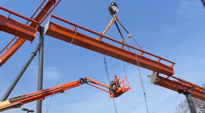 Crews worked throughout the morning to put the last orange piece in place, moving the project one giant step closer to overall completion.