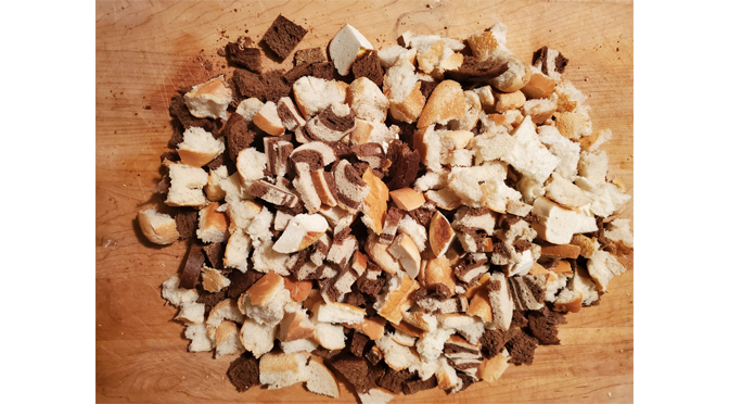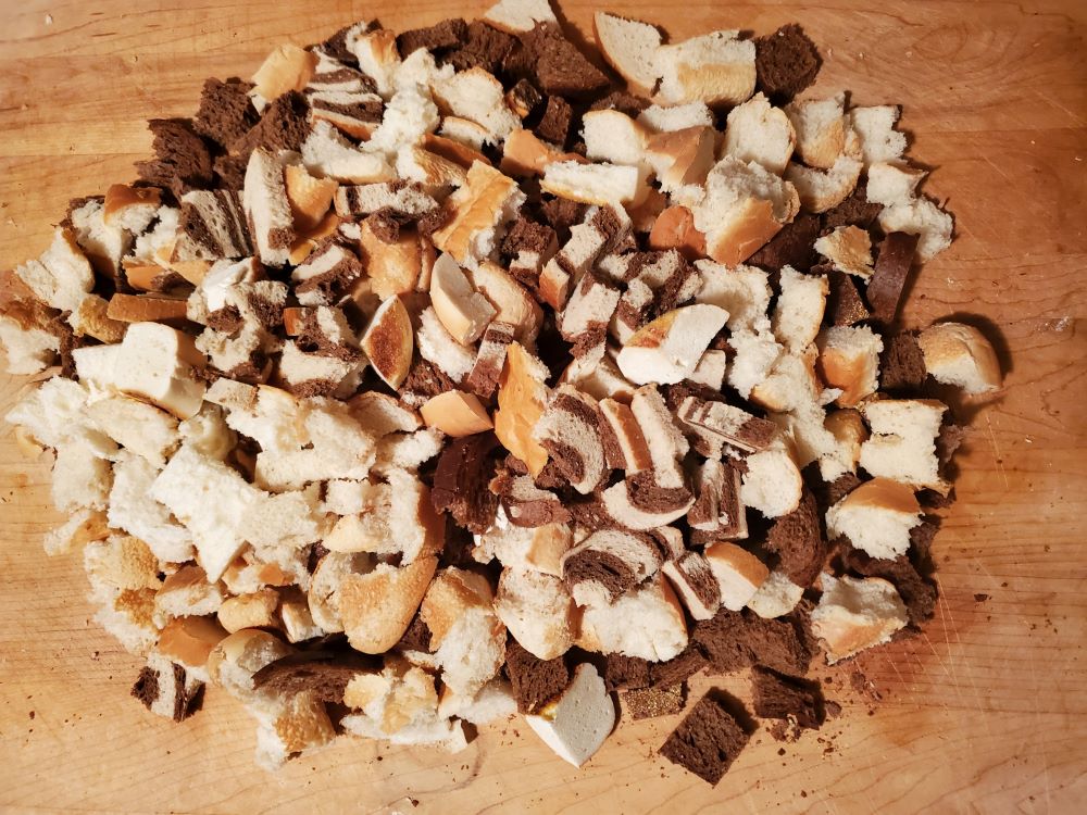 When making sandwiches, toast, crostini, French toast, hot dog/hamburger rolls, and so on. How many people save their bread ends? I even shop at the discount rack (1 or 2 day old bread), for deals on wheats, ryes and sourdoughs. Perfect for soaking whether it be French toast or homemade croutons. Even better as bread filling….all these different types of breads, combined with cooked veggies and herbed broth and even leftover potatoes.