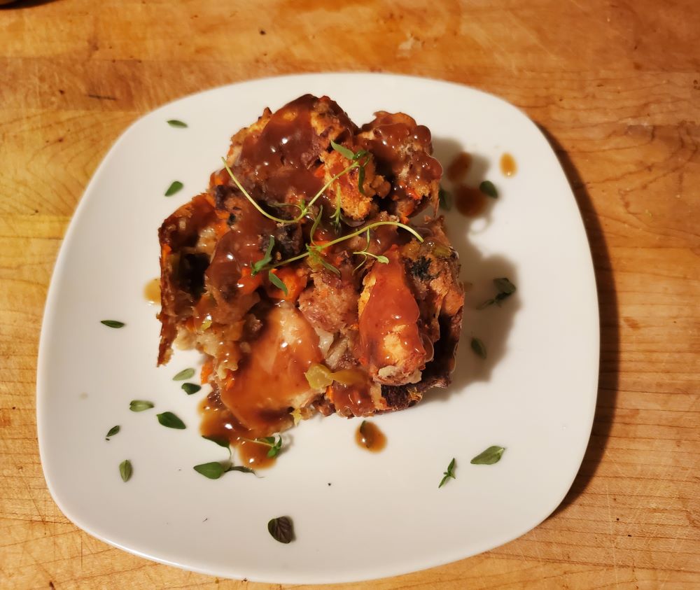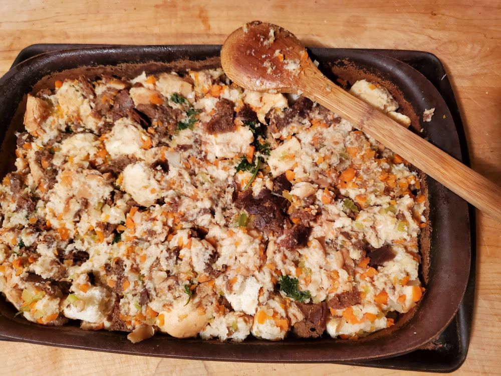 No real recipe, other than storing your leftover bread ends in the freezer for up to a month or until you have enough to make a 13 x 9 pan or more for a crowd. a couple quarts of chicken, veggie or beef broth, finely chopped carrots, onions, celery, parsley. I usually add some dried aromatic herbs like thyme, savory, little rosemary in as I’m mixing the bread and broth together before baking.