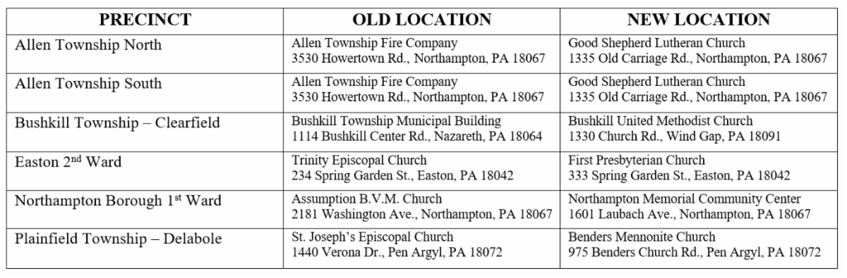 Anyone with questions, or if you would like to check your polling location, call the Northampton County Elections Office at 610-829-6260 or enter your address at: www.vote.pa.gov/pollingplace.