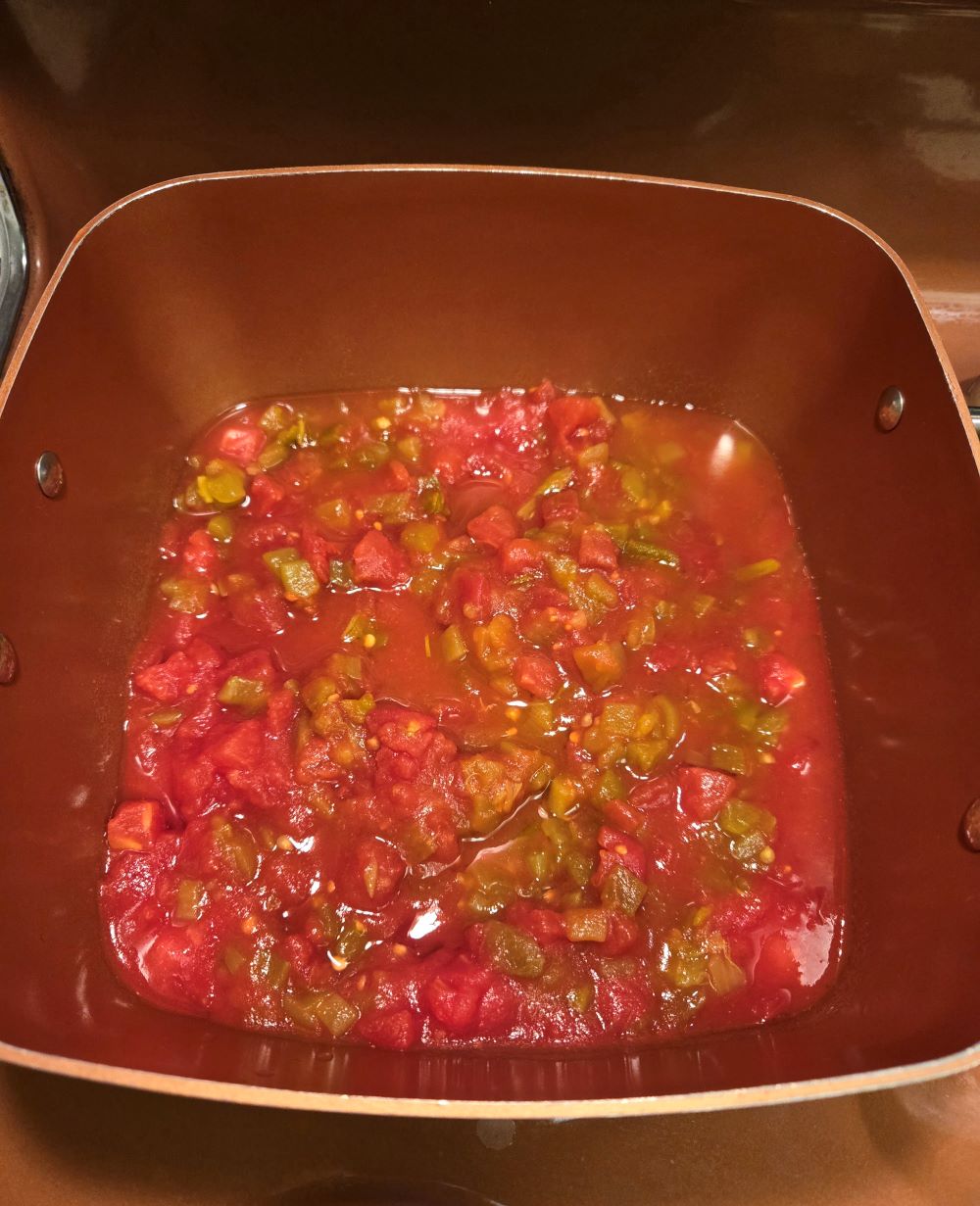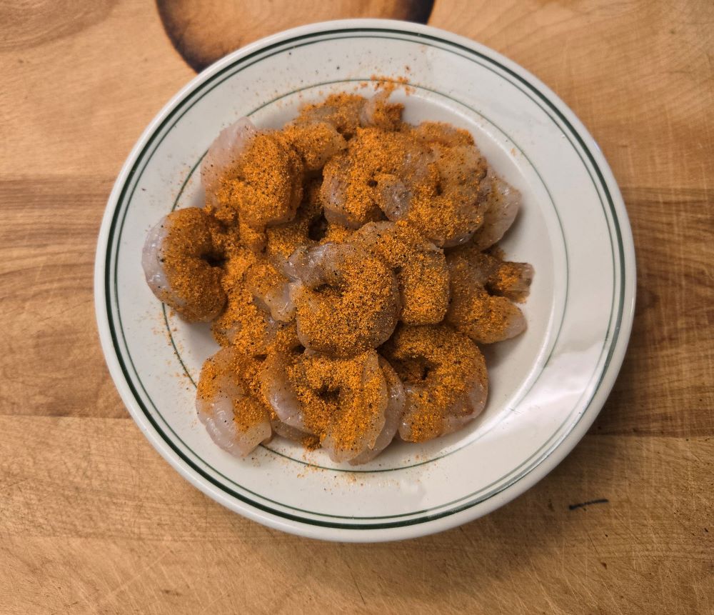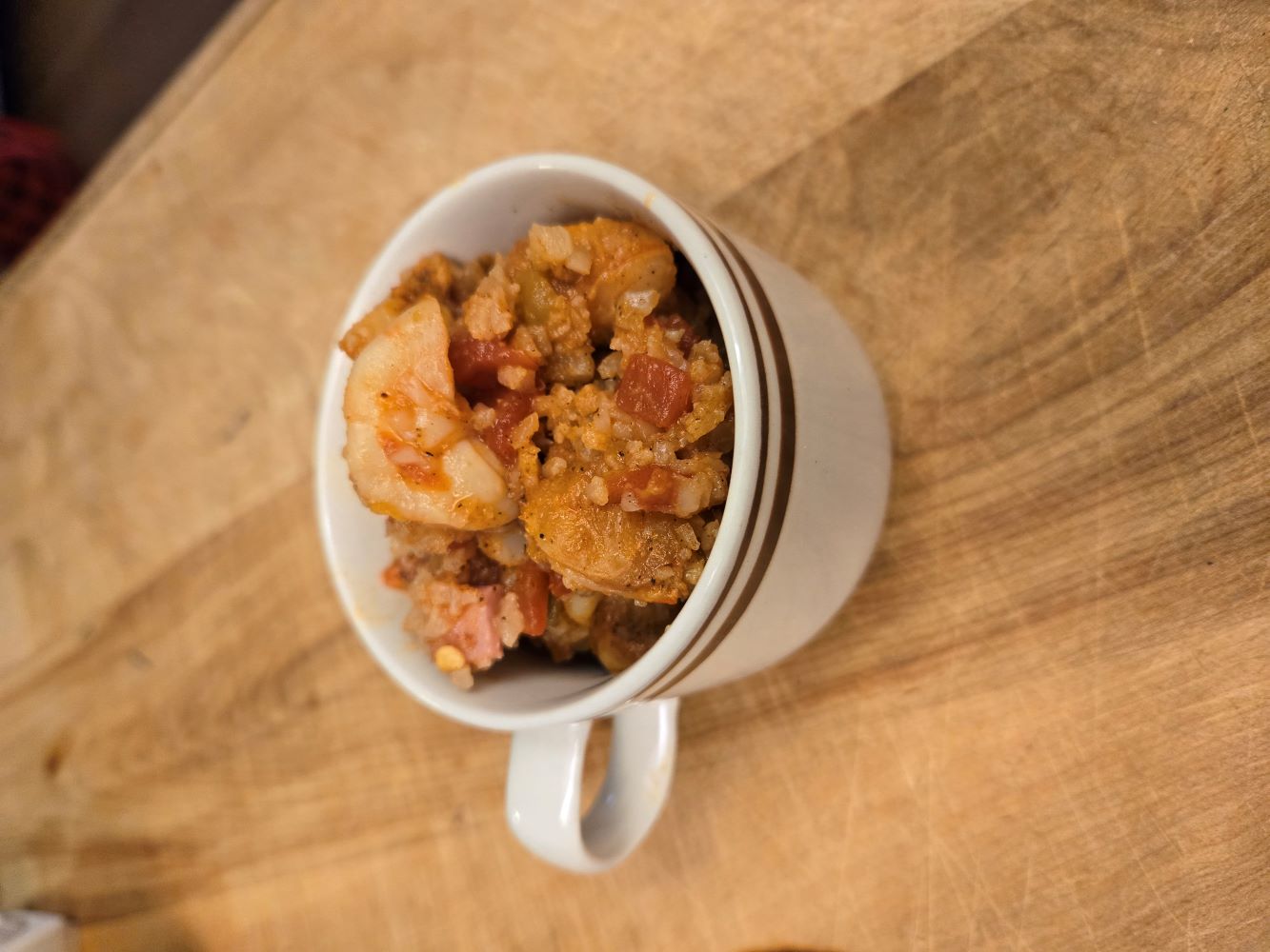 Add canned tomatoes, minced chilies and onions to medium sauce pot, bring to simmer. Once tomato mixture comes to a slight boil, add in the riced cauliflower, stir to combine. Season shrimp with spices listed above or a prepackaged mix. (I found Kinders wood smoked garlic and combined some of it with chili powder and cumin). Add 3T garlic confit and some of the oil to a medium skillet, bring to a sizzle. Add in shrimp and cook till slightly pink. Remove from heat and let cool to touch. Cut into bite size pieces.