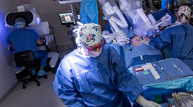 Featured Image: Daniel Harrison, DO (left sitting at console), Lehigh Valley Institute for Surgical Excellence, and operating room staff perform one of the health network’s first procedures on a patient using the latest da Vinci surgical robot the dV5, one of just 14 in the world and the only one in Pennsylvania. (Provided by LVHN)