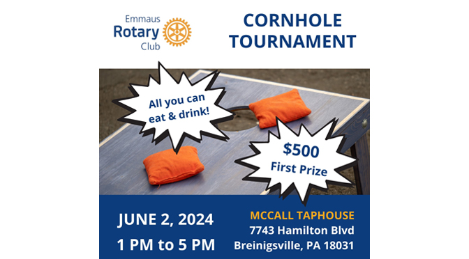 The Emmaus Rotary Club is excited to announce its upcoming Charity Cornhole Tournament, promising a day of fun, food, and friendly competition for a great cause. Scheduled for June 2, 2024, from 1 PM to 5 PM, the tournament will take place at the McCall Taphouse located at 7743 Hamilton Blvd, Breinigsville, PA 18031.