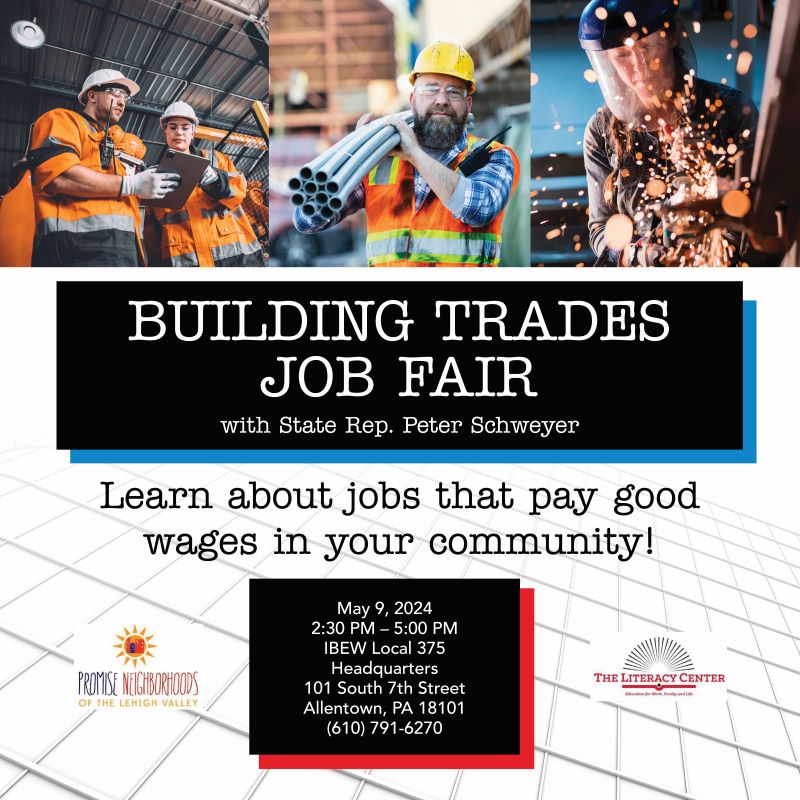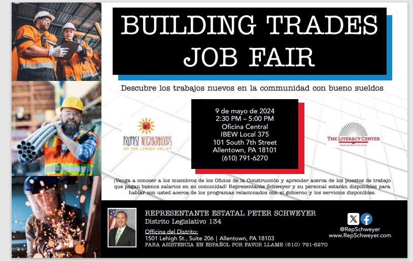 ALLENTOWN,  –  Those looking for positions or more information about careers in the construction industry are encouraged to attend State Rep. Peter Schweyer’s building trades job fair, next Thursday, May 9.