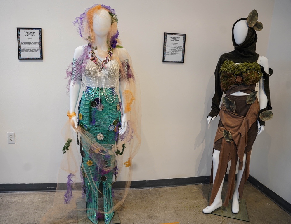 Clementina Martinez Masarweh created the mermaid-like dress in the exhibition. The materials used were secondhand textile waste, biodegradable fashion, plants and recycled paper.