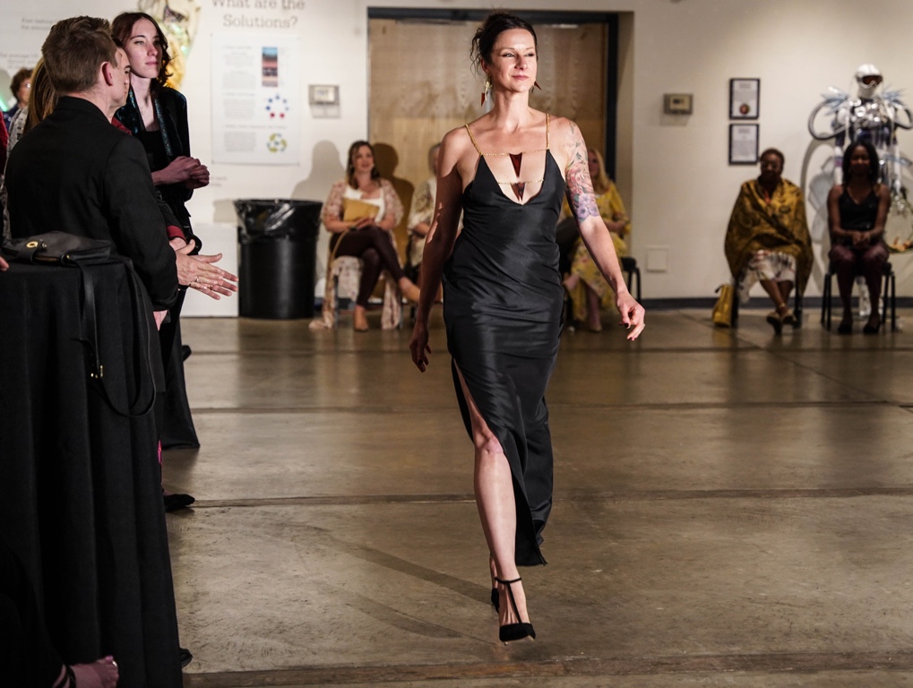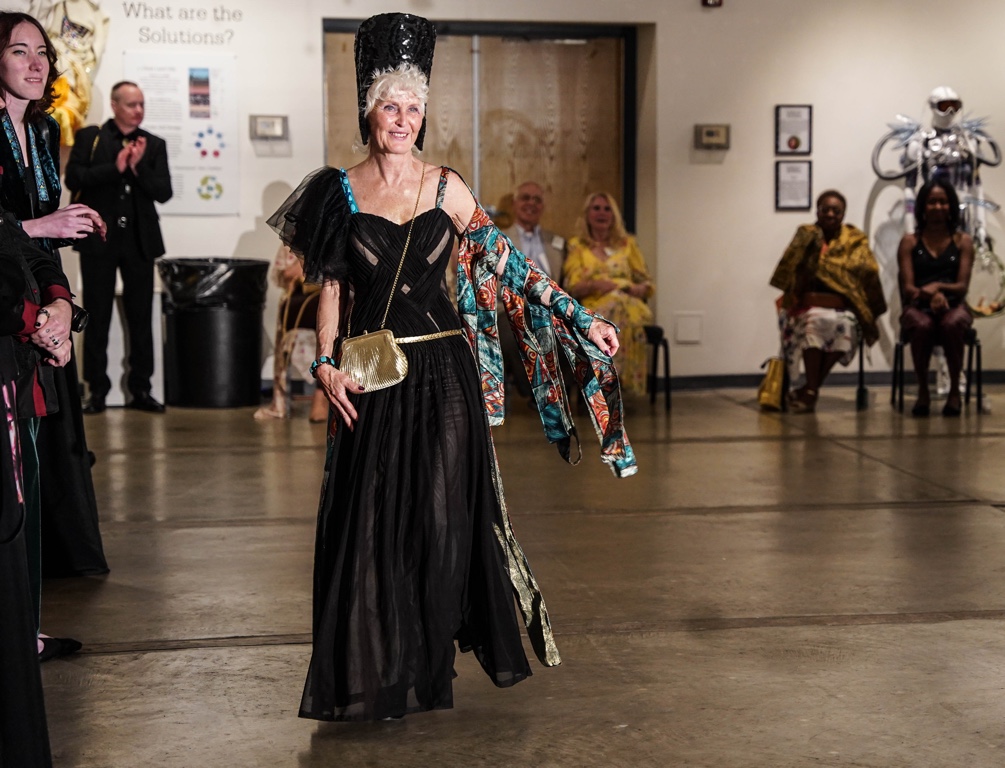 In the last category, Best Emerging Designer, Janel Shelly led with a black gown adorned by brown wood pieces, placed on the front and back of gown. The wood was from Martin Guitars. Alexa Nicole Villafana, wore a strapless gown that had a former life as a throw rug (winner), and Jennifer Schwartz who closed the event with a decorate hat.