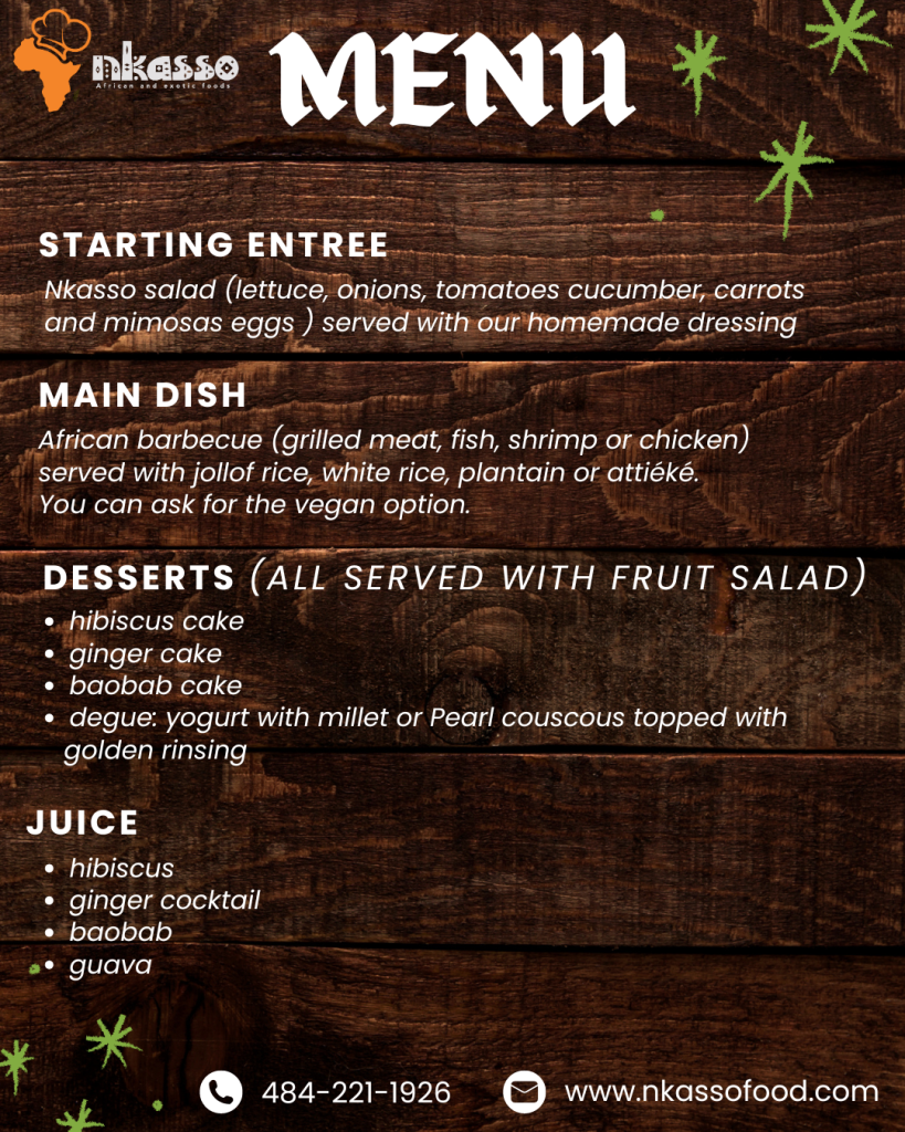All Nkasso recipes are steeped with West African influence, culture, history, and tradition. The goal is to make all guests feel “Nkasso” or my home. Nkasso is a family-owned business that values innovation, commitment, and responsibility.