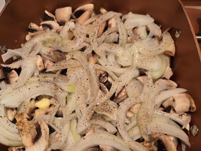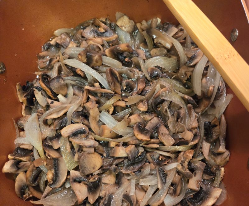 Heat up olive oil and butter in medium saucepan. Add mushrooms, garlic, onions, salt and pepper, cover and let it cook down a bit. The mushroom and onions will release water/moisture which will create a nice broth. Don’t toss it away, strain and use in soups and sauces. Once this mixture comes together, taste and adjust seasonings.