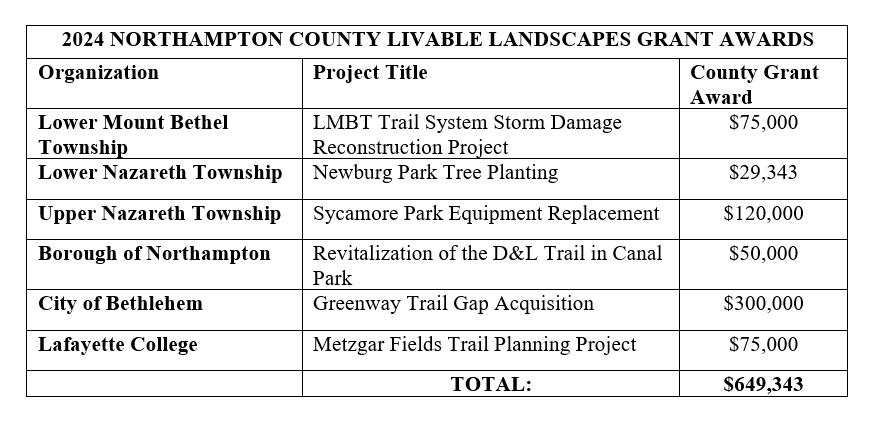 County Executive Lamont G. McClure and the Parks and Recreation Division are pleased to announce that Northampton County Council voted to approve Executive McClure’s 2024 Livable Landscape Grant plan by a vote of 9-0 at the Thursday, June 20th meeting. County Council approved all grant projects presented for a total grant award of $649,343.