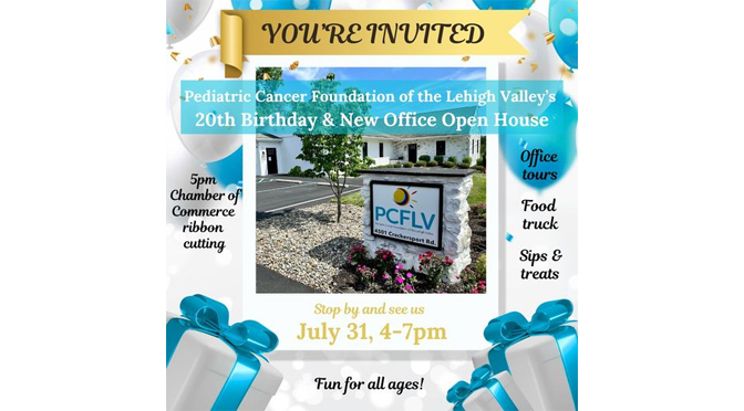 ALLENTOWN, PA – Monday, July 29, 2024 — The Greater Lehigh Valley Chamber of Commerce will host a 20th Birthday Celebration & Ribbon Cutting Ceremony for the Pediatric Cancer Foundation of the Lehigh Valley on Wednesday, July 31, 2024. The open house will run from 4 p.m. to 7 p.m. and the ribbon cutting ceremony will take place at 5:00 p.m. sharp. Members of the media are invited to attend.