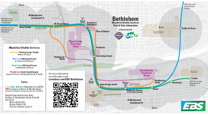Gold, Blue, & Green (Operated by LANTA) FREE to board at these 14 Shuttle Stops. Sponsored by Bethlehem Parking Authority & City of Bethlehem