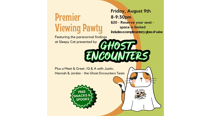 Tickets can be purchased here: https://sleepycaturbanwinery.square.site/product/ghost-encounters-viewing-pawty-at-sleepy-cat/802