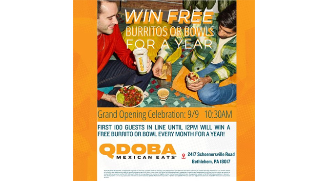 QDOBA Mexican Eats, named as “Best Fast Casual Restaurant” for six consecutive years in the USA Today 10Best Readers’ Choice Awards, is thrilled to announce its newest location at 2417 Schoenersville Rd Bethlehem, PA, where the first 100 guests in line till 12 PM will win a free burrito or bowl every month for a year. Members of the media are invited to attend.