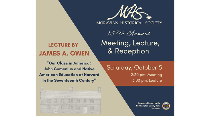 Nazareth, PA—The Moravian Historical Society will hold its 167th Annual Meeting, Lecture, and Reception on Saturday, October 5, 2024. James Owen, Assistant Director and Instructor in the Institute of Native American Studies at the University of Georgia, will present the 167th Annual Lecture. The talk, entitled “Our Class in America: John Comenius and Native American Education at Harvard in the Seventeenth Century” explores the role of John Comenius in developing educational plans at the Harvard Indian School.