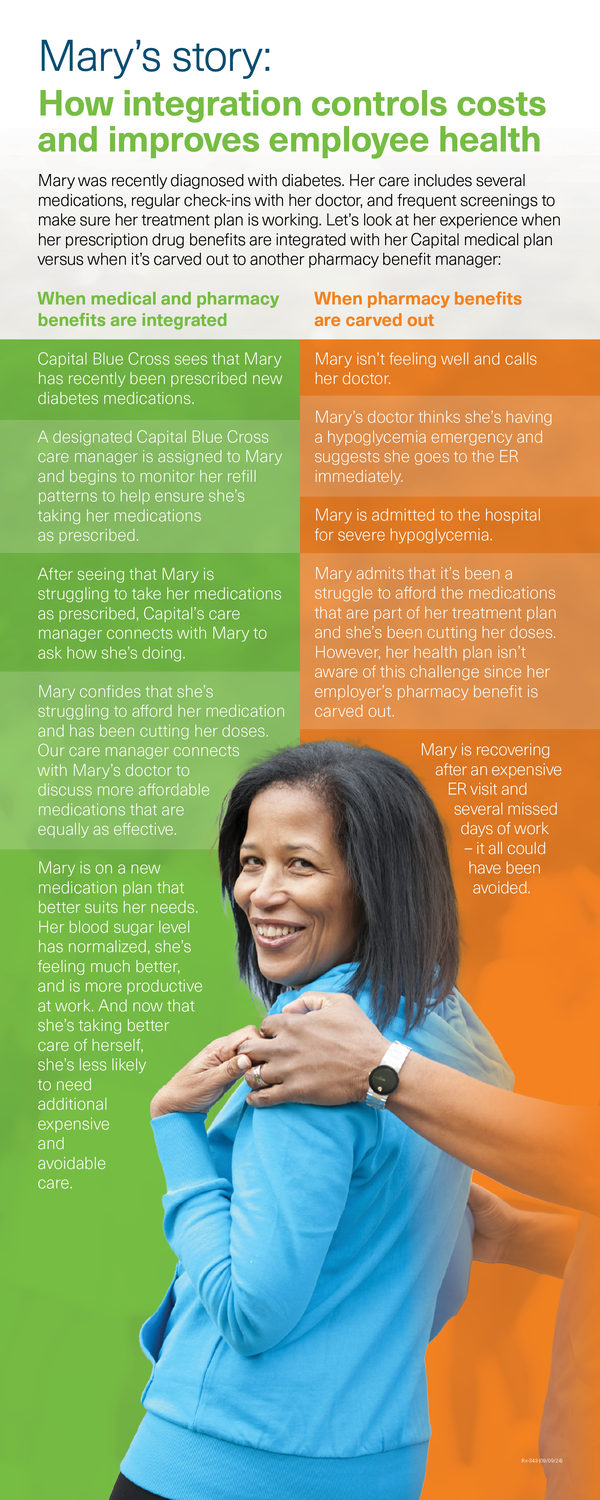 Capital Blue Cross is helping its employer groups collectively save millions of dollars annually with a simple solution: integrate prescription drug coverage and medical coverage into the same plan. The results? Having medical and drug coverage in one plan provides clear, actionable data employers can use to help keep their employees healthy, save money, and provide a more efficient experience.