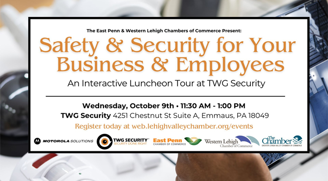 The East Penn and Western Lehigh Chambers of Commerce are thrilled to host the upcoming Safety and Security Luncheon, in partnership with TWG Security and trusted collaborator, Motorola Solutions. Set for October 9, 2024, from 11:30 AM to 1:00 PM, this event is designed to equip businesses and employees with essential knowledge about effective security solutions that can truly make a difference. In today’s world, ensuring the safety and security of the workplace is more crucial than ever.
