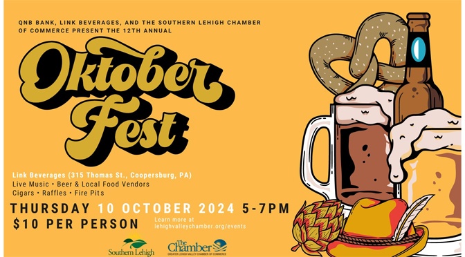 The Southern Lehigh Chamber of Commerce is excited to invite you to the 12th Annual Oktoberfest, partnered with QNB Bank and Link Beverages, happening on October 10, 2024, from 5:00 PM to 7:00 PM at Link Beverages. This cherished community event promises an unforgettable evening filled with local flavor and vibrant camaraderie.