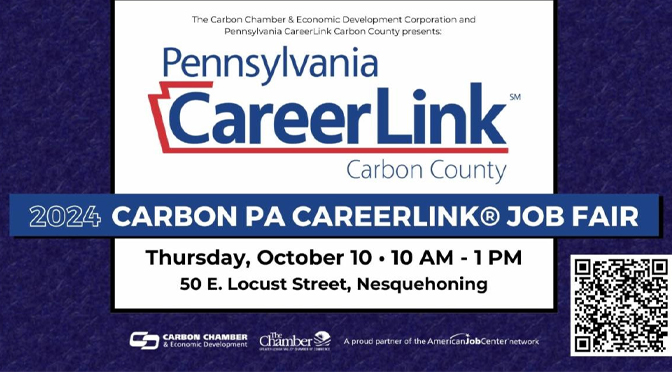 Carbon County, PA – The Carbon County Chamber & Economic Development Corporation, proud partner of the Greater Lehigh Valley Chamber of Commerce, is excited to partner with Carbon PA CareerLink and the Pocono Counties Workforce Development Area for the 2024 Carbon PA CareerLink Job Fair! The event will take place on Thursday, October 10, from 10 AM – 1 PM at PA CareerLink Carbon County, located at 50 E. Locust St., Nesquehoning.